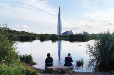 U Les rêves deviennent une réalité. Gazprom voulait depuis longtemps s'implanter à St-Pétersbourg, c'est la ville natale de son directeur général, mais aussi de ses amis, le président et le premier ministre. En 2006, l'entreprise prévoit de construire son nouveau siège, sur les bords du fleuve Neva, en face du centre historique. Le centre historique de St-Pétersbourg, c'est un musée à ciel ouvert de 500 km2, abritant 4000 monuments inscrits au patrimoine mondial. Les St-Pétersbourgeois sont très fiers de leur ville, ils se sentent investis d'un devoir de protection. Soutenus par l'UNESCO, ils ont fait savoir leur opposition à la construction d'une tour géante au centre-ville. Le bras de fer n'a pas duré, Gazprom, qui veut faire de son nouveau siège une ouverture vers les marchés européens, une image de la Russie moderne, ne pouvait pas commencer son projet par une épreuve de force. La multinationale a acquis des terrains à 9 km du centre, au nord de la ville. Sur les berges du golfe de Finlande, à l'embouchure de la Neva et du canal de Lakhta. Les architectes Tony Kettle et Philipp Nikandrov du bureau RMJM/Gorproject imaginent un bâtiment multifonctionnel de 300 000 m2. La moitié de la surface est fournie par la tour et occupée par les bureaux de la multinationale. Le reste du complexe est partagé par un amphithéâtre dédié aux spectacles aquatiques, des salles de sport, un centre médical, des espaces commerciaux, un planétarium. La culture si chère à St-Pétersbourg n'a pas été oubliée, avec 3 musées et des salles de concert. Des parcours didactiques sur l'énergie, la spécialité de la maison, et un centre d'éducation scientifique. La tour qui ouvrira ses portes vers la fin de l'année proposera un restaurant panoramique tournant au 77e (300 m) et une terrasse publique au 86e, avec une vue imprenable sur la Venise du Nord à l'altitude de 357 m. Jusqu'à présent, le point de vue le plus haut de St-Pétersbourg, ouvert aux touristes, est la cathédrale St-Isaac, avec ses colonnades culminant à 51 m.